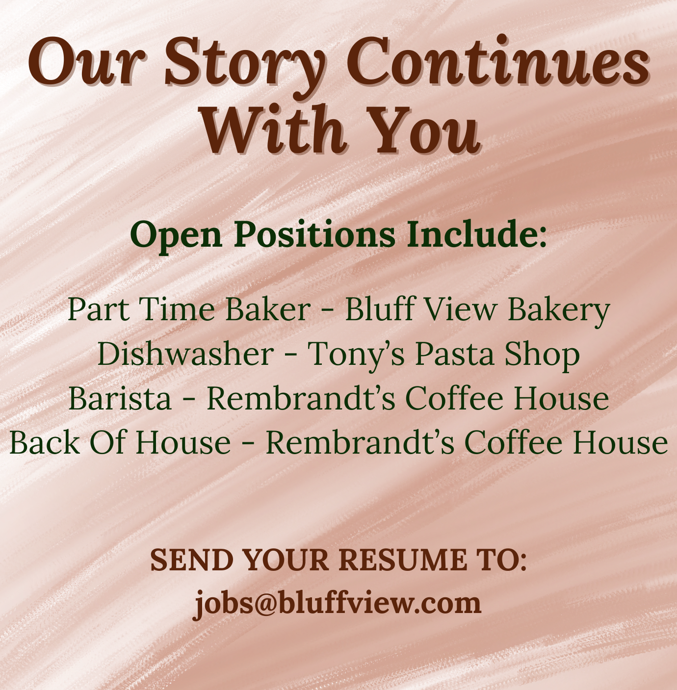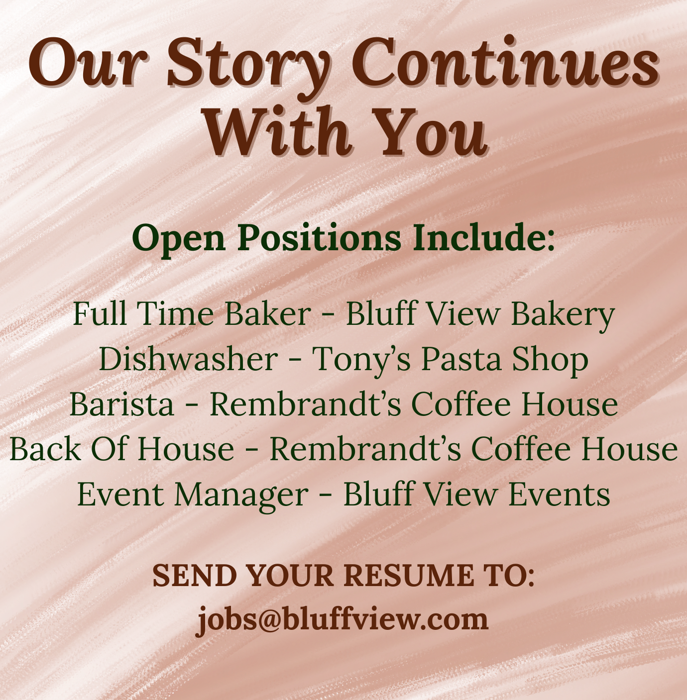 Spend an afternoon on the patio of Rembrandt's Coffee House enjoying coffee roasted by Rembrandt's Roasting Company, or pick up a loaf of artisan bread baked fresh by Bluff View Bakery and take a stroll in the acclaimed River Gallery Sculpture Garden and enjoy all that Bluff View Art District has to offer.